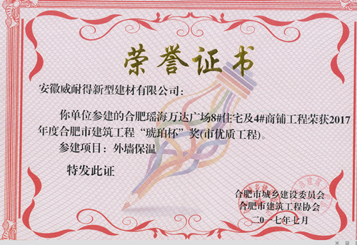 ,安徽威耐得新型建材有限公司收到了合肥市城鄉(xiāng)建設(shè)委員會和合肥市建筑業(yè)協(xié)會寄來的證書,由公司參建的 合肥瑤海萬達(dá)廣場 8#住宅及4#商鋪